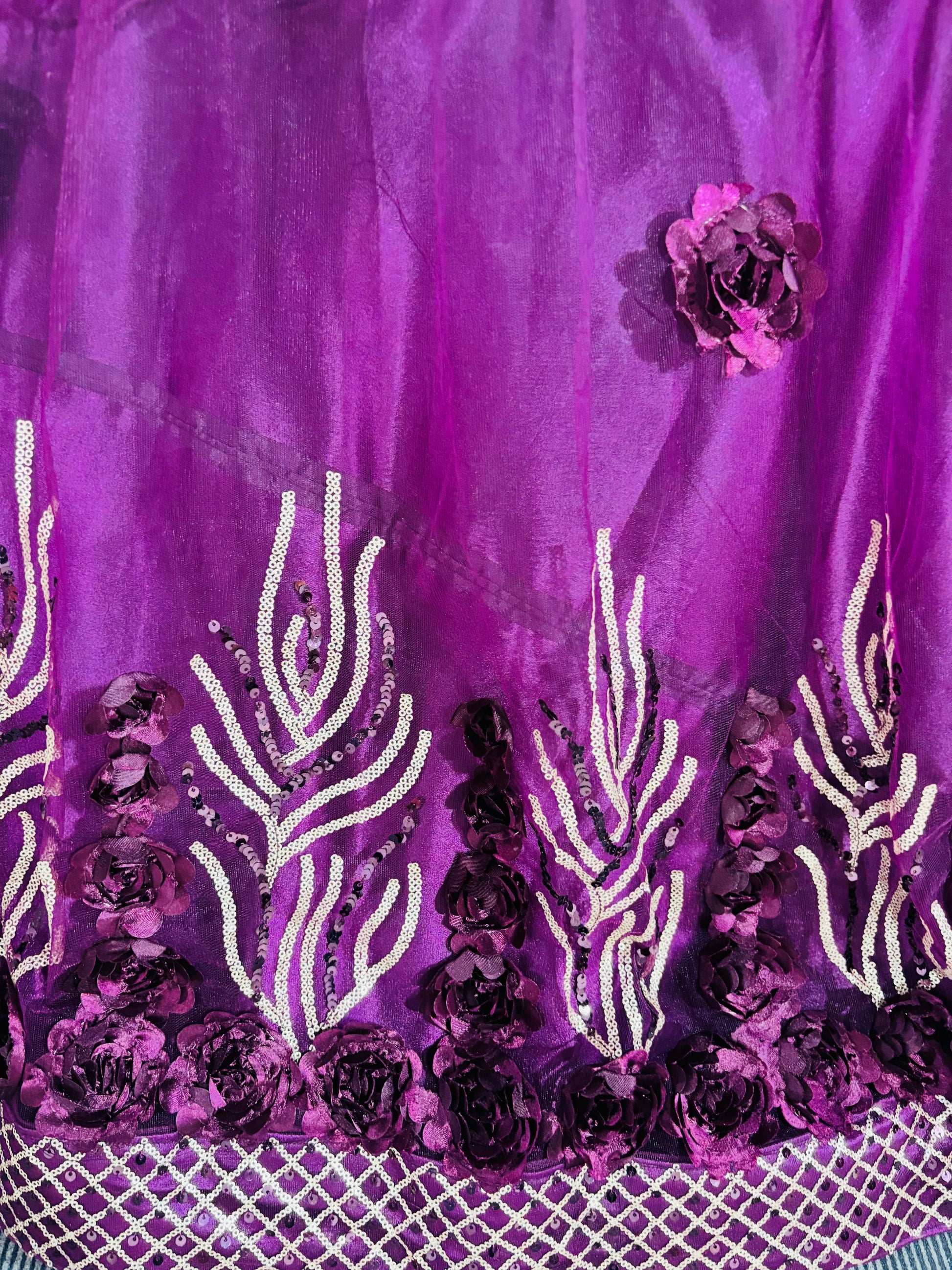 • Lehenga: Flowing net skirt in deep plum, enriched with applique work, sequin accents, and an ornate embroidered hemline that exudes opulence.